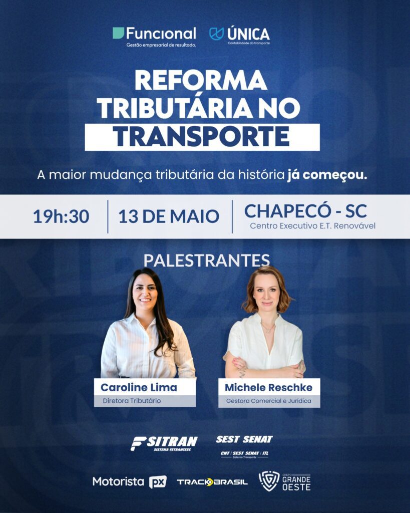 A nova realidade tributária brasileira e seus efeitos sobre o setor de transporte estarão em pauta no evento “Reforma Tributária no Transporte”, marcado para o dia 13 de maio, às 19h30, no Centro Executivo E.T. Renovável, em Chapecó-SC. Com realização da Funcional e da ÚNICA, e apoio institucional do Sitran e do SEST SENAT, o encontro reunirá transportadoras, empresários do setor logístico e donos de frota para discutir as mudanças que já começaram a exigir adaptação das empresas.